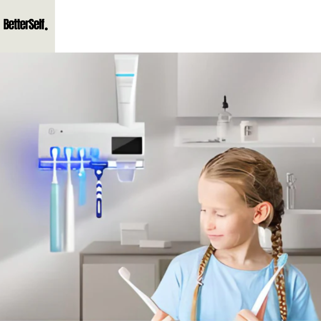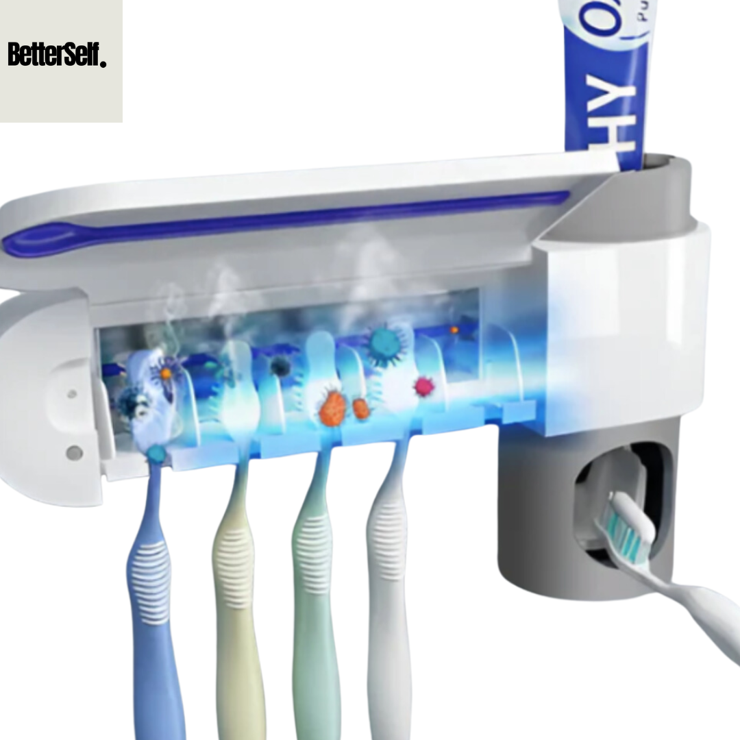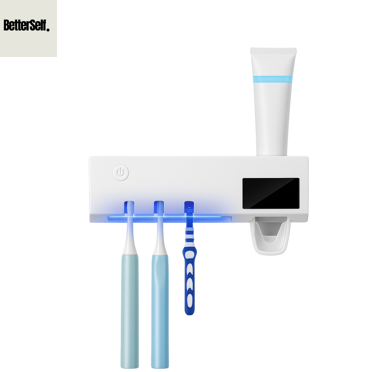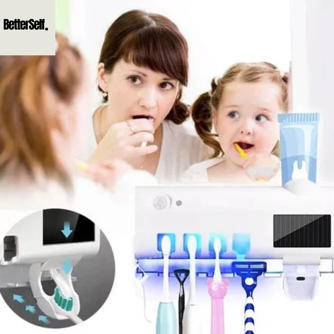 →Soporte esterilizador UV para cepillos de dientes con dispensador de crema dental.